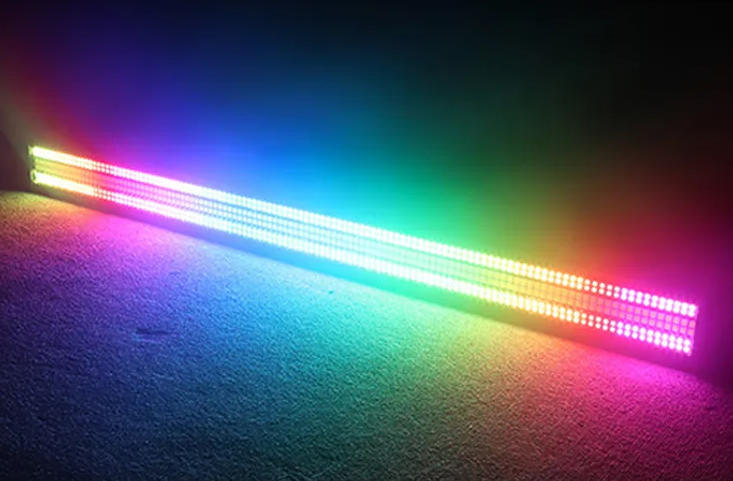 Sistema de iluminação estroboscópico RGB profissional com 72 segmentos totais para efeitos visuais dinâmicos em aplicações de entretenimento e palco.